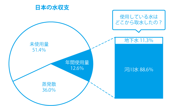 降った雨の内35%(約2,300億m3)は蒸発散してしまいますが、残りの65%(約4,100億m3)は利用可能な水の量として考えられ、これを「水資源賦存量(理論上、人が最大限利用可能な量)」といいます。しかし実際に使用している水量は、2011年の取水量ベースで年間約809億m3であり、平均的な水資源賦存量の20%に相当します。